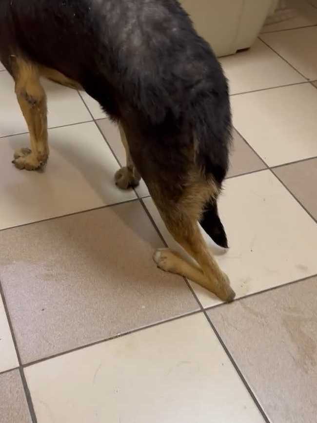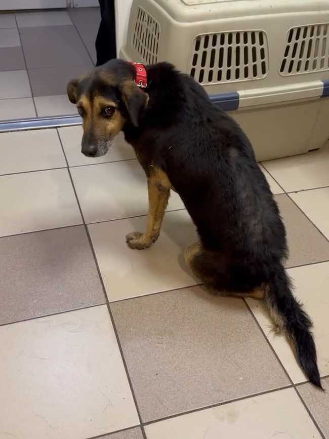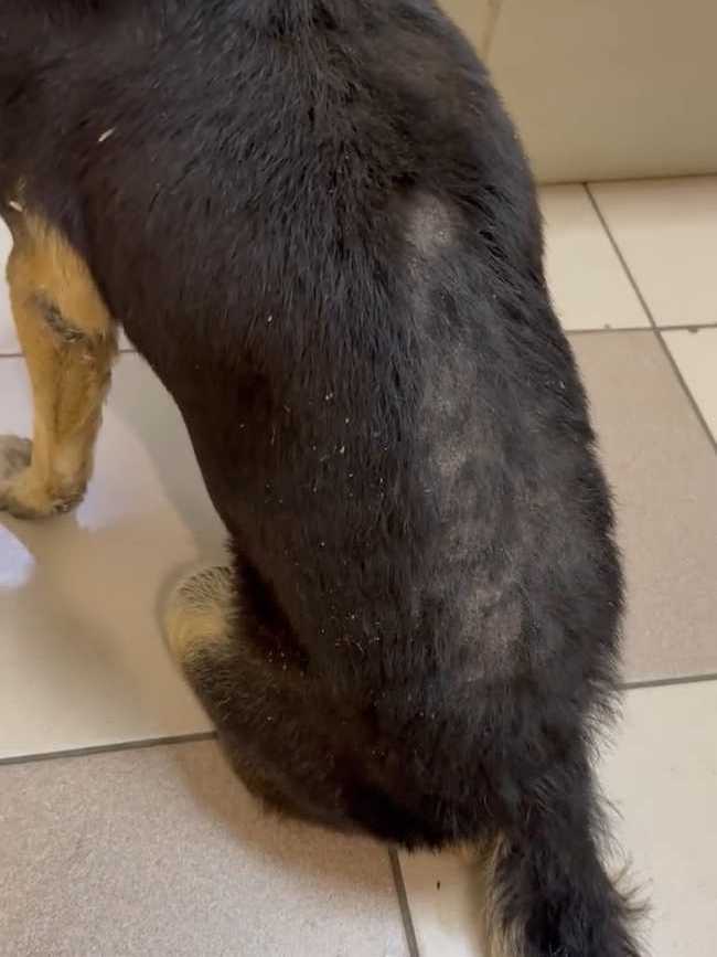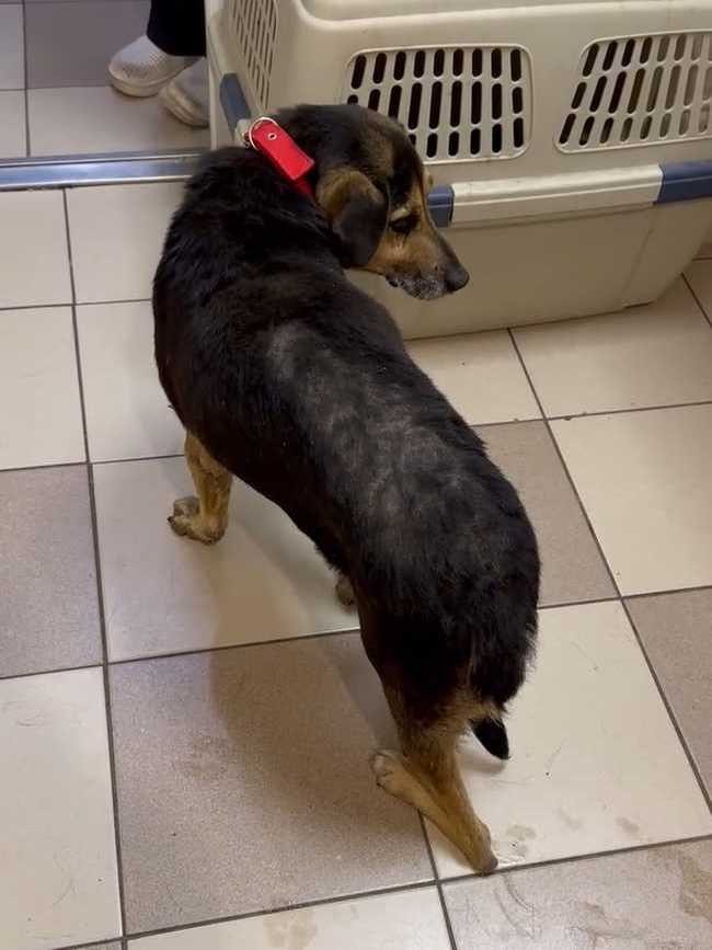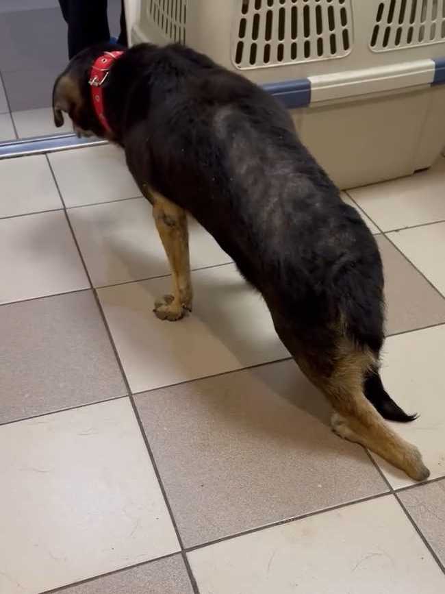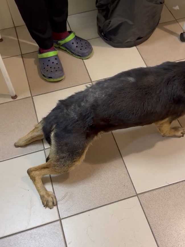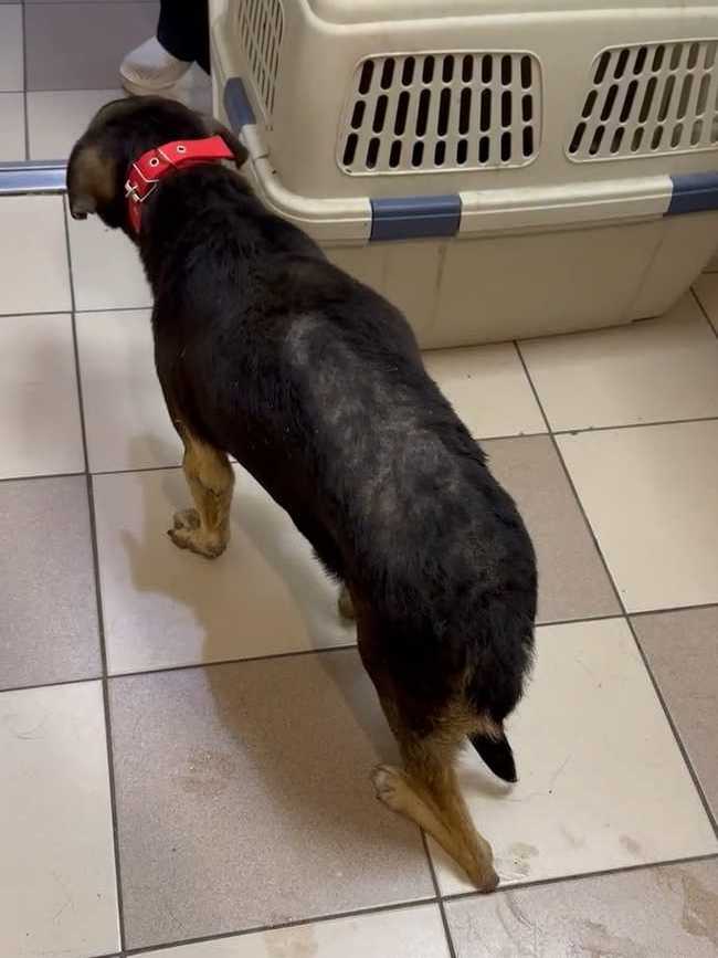 Отвезли его в клинику. Конечно, пёс очень сложный, но ребятам отказать не смогли. Покормили перед выездом чем смогли, каким-то супом, но по дороге его желудок не выдержал. Жалко смотреть на парня. Уже старенький, лысый по позвоночнику. Особенно большая проблема с задними лапками. С ними беда с детства и это уже не исправить. А вот с залысинами клиника обещала нам помочь.