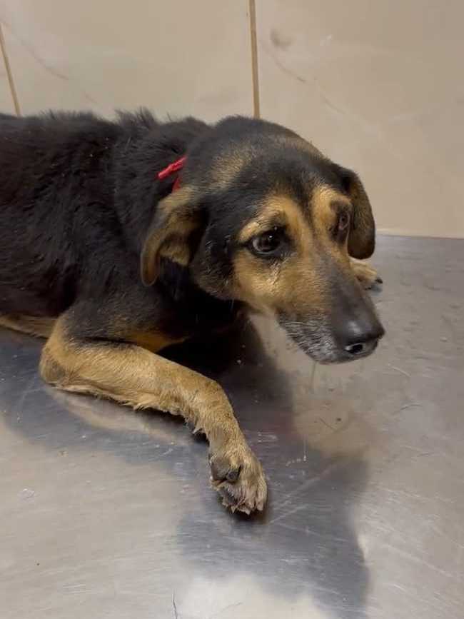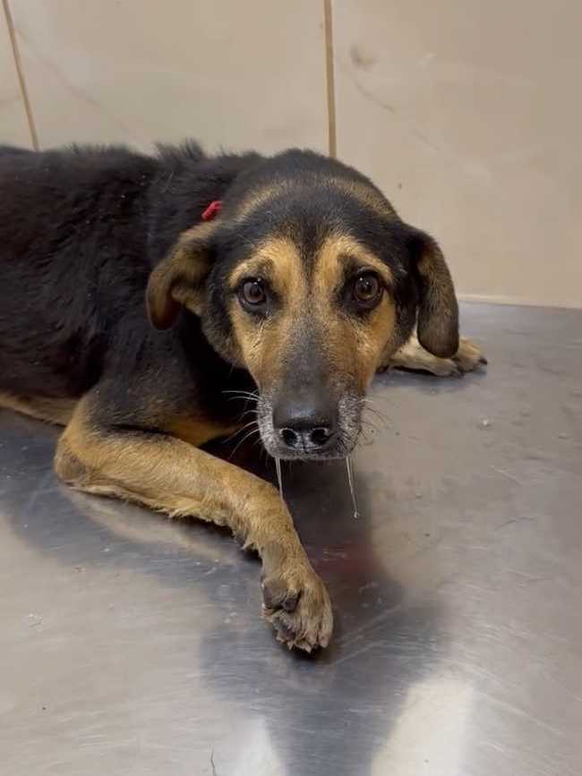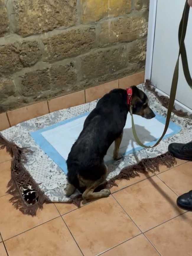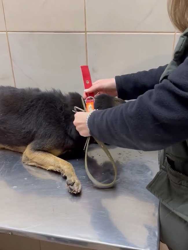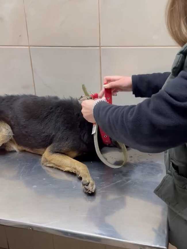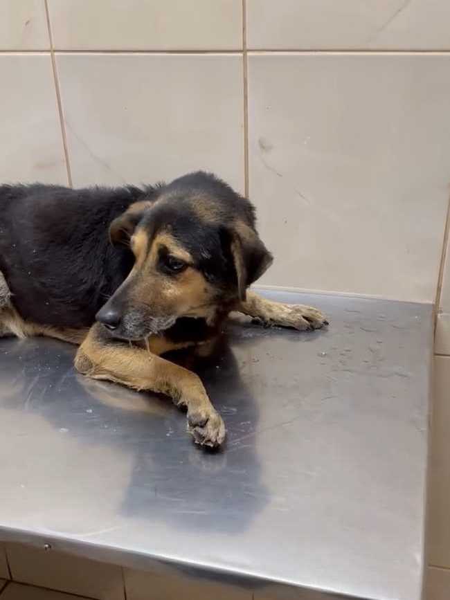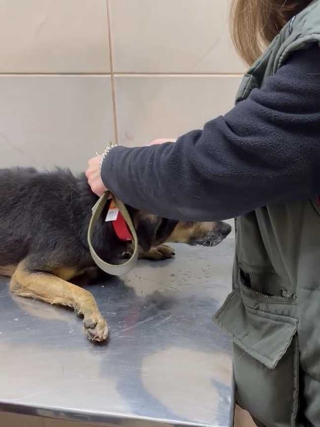 Отвезли его в клинику. Конечно, пёс очень сложный, но ребятам отказать не смогли. Покормили перед выездом чем смогли, каким-то супом, но по дороге его желудок не выдержал. Жалко смотреть на парня. Уже старенький, лысый по позвоночнику. Особенно большая проблема с задними лапками. С ними беда с детства и это уже не исправить. А вот с залысинами клиника обещала нам помочь.