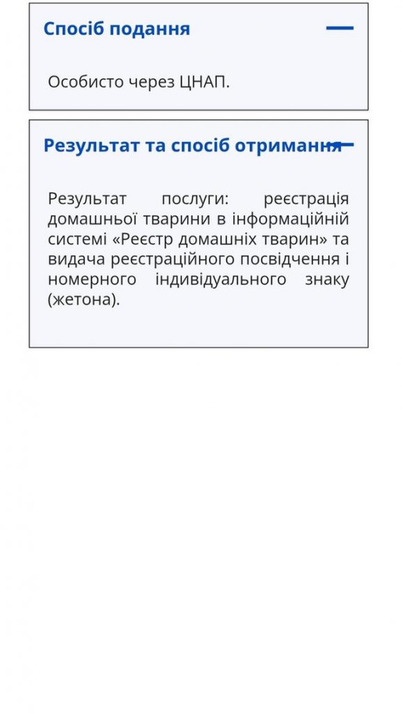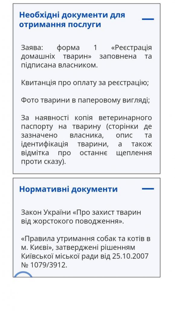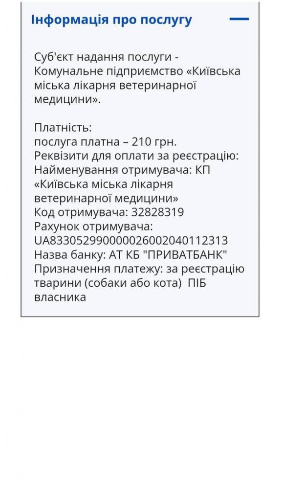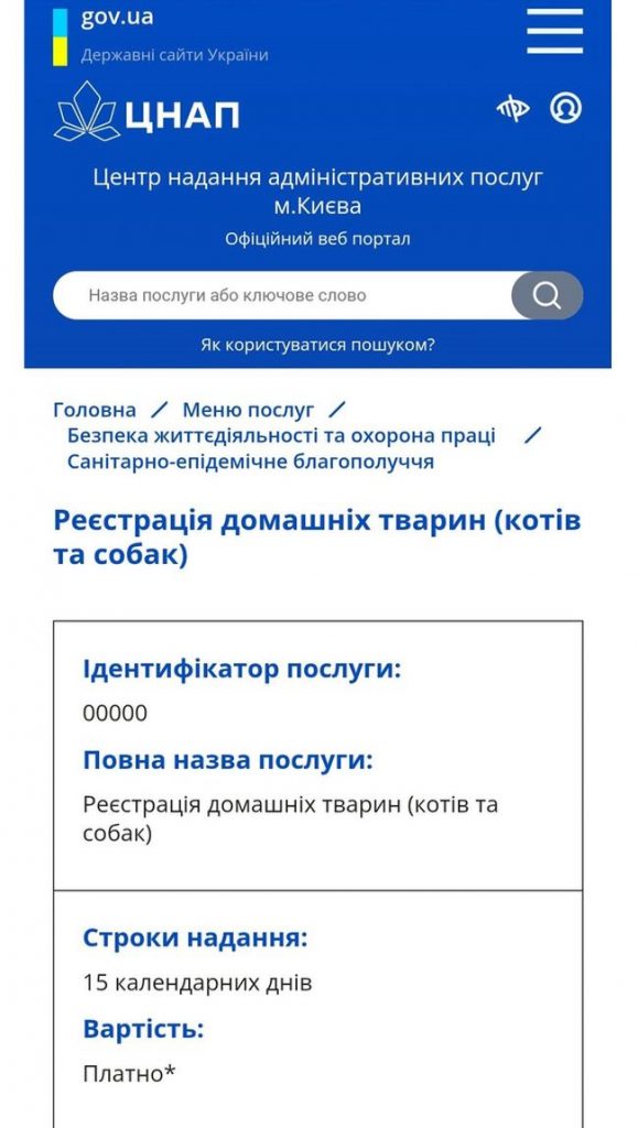 На сайте ЦНАПа отмечается, что сроки предоставления услуги составляют 15 дней, а за одно животное придется заплатить 210 гривен. После оформления регистрации животному присваивают индивидуальный номер, а владельцу выдается официальное свидетельство, подтверждающее право собственности на любимца.